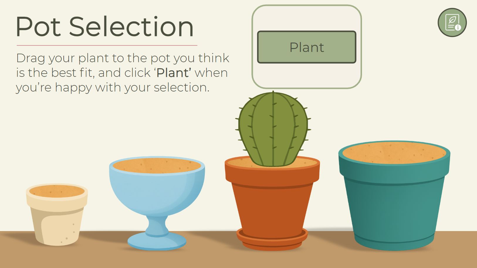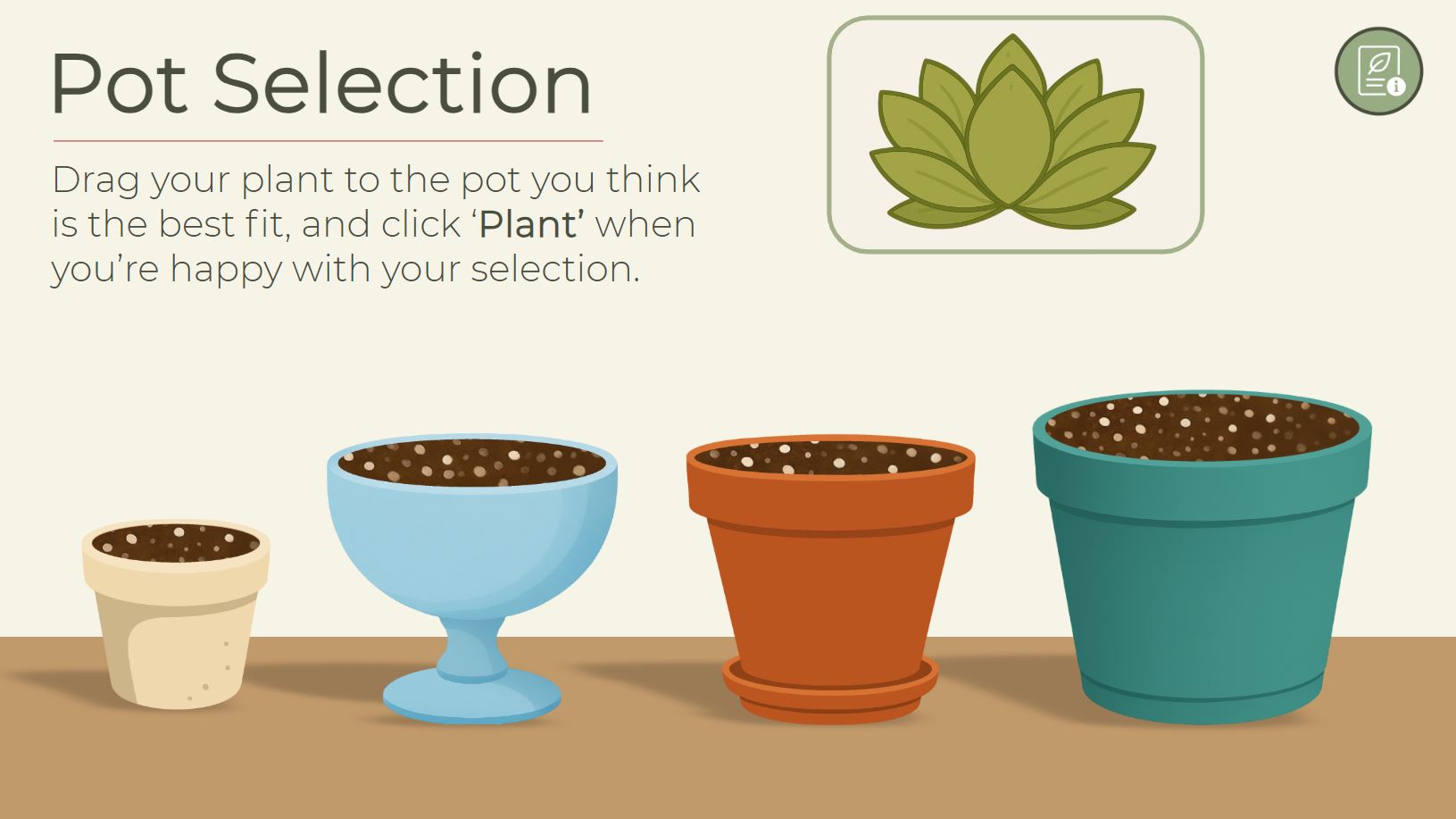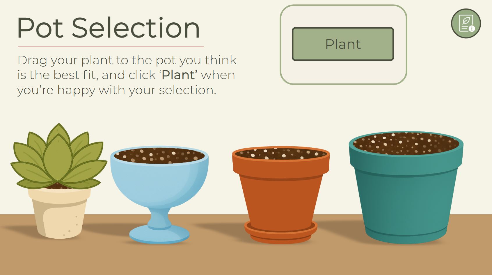 With their soil chosen, learners move on to a drag-and-drop activity to complete the repotting of their plant. There are four pots to choose from, and learners can drag and drop their plant onto each one to see if it is a good fit. One pot is meant to be too small, another is a good fit but has no drainage, one is a perfect fit with drainage, and the last is too large for the plant. Again, learners receive immediate feedback on their choice and can see their plant repotted in the selected pot with the soil they chose earlier.
