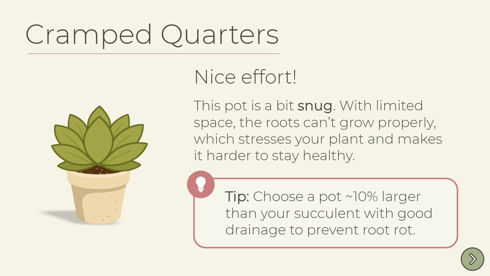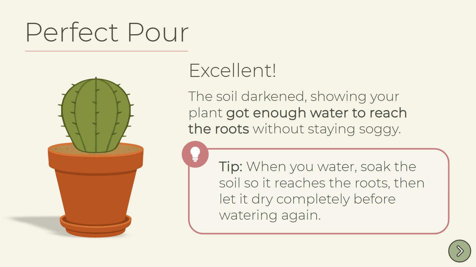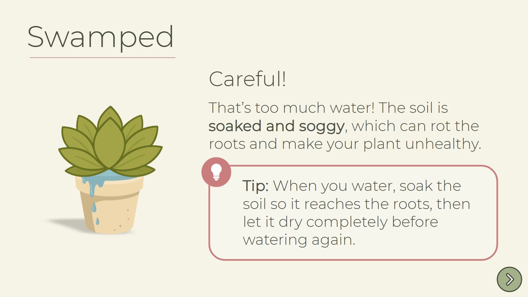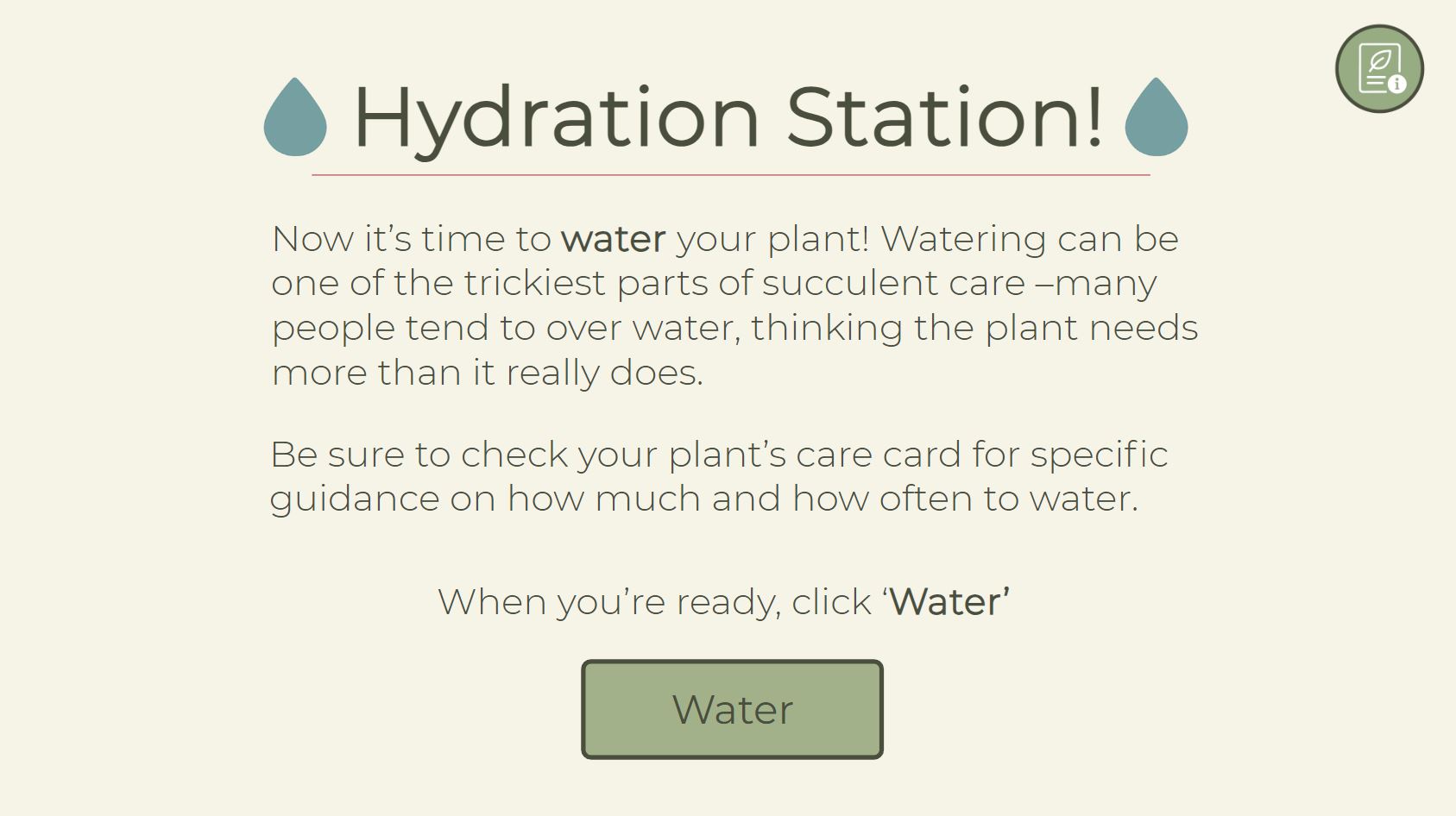 After choosing a plant, learners are presented with its care card, which provides basic and intentionally vague instructions for soil, pot, sunlight, and watering. This card guides learners’ choices without directly giving the correct answers, allowing them to experiment and see the consequences of their decisions. The care card remains available throughout the course, so learners can consult it whenever they need guidance before making a care decision. It serves as both a learning aid and a quick reference tool, reinforcing key takeaways. After each choice, learners receive feedback indicating whether the decision was beneficial for their plant.