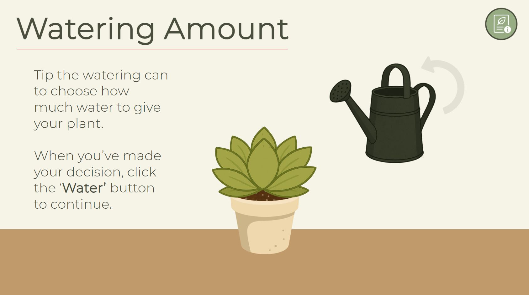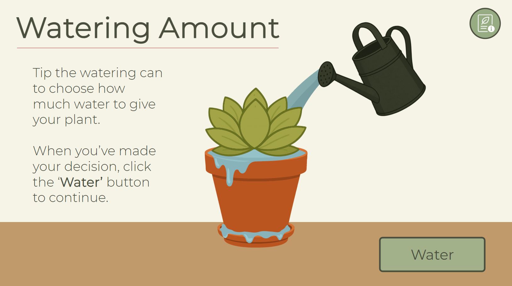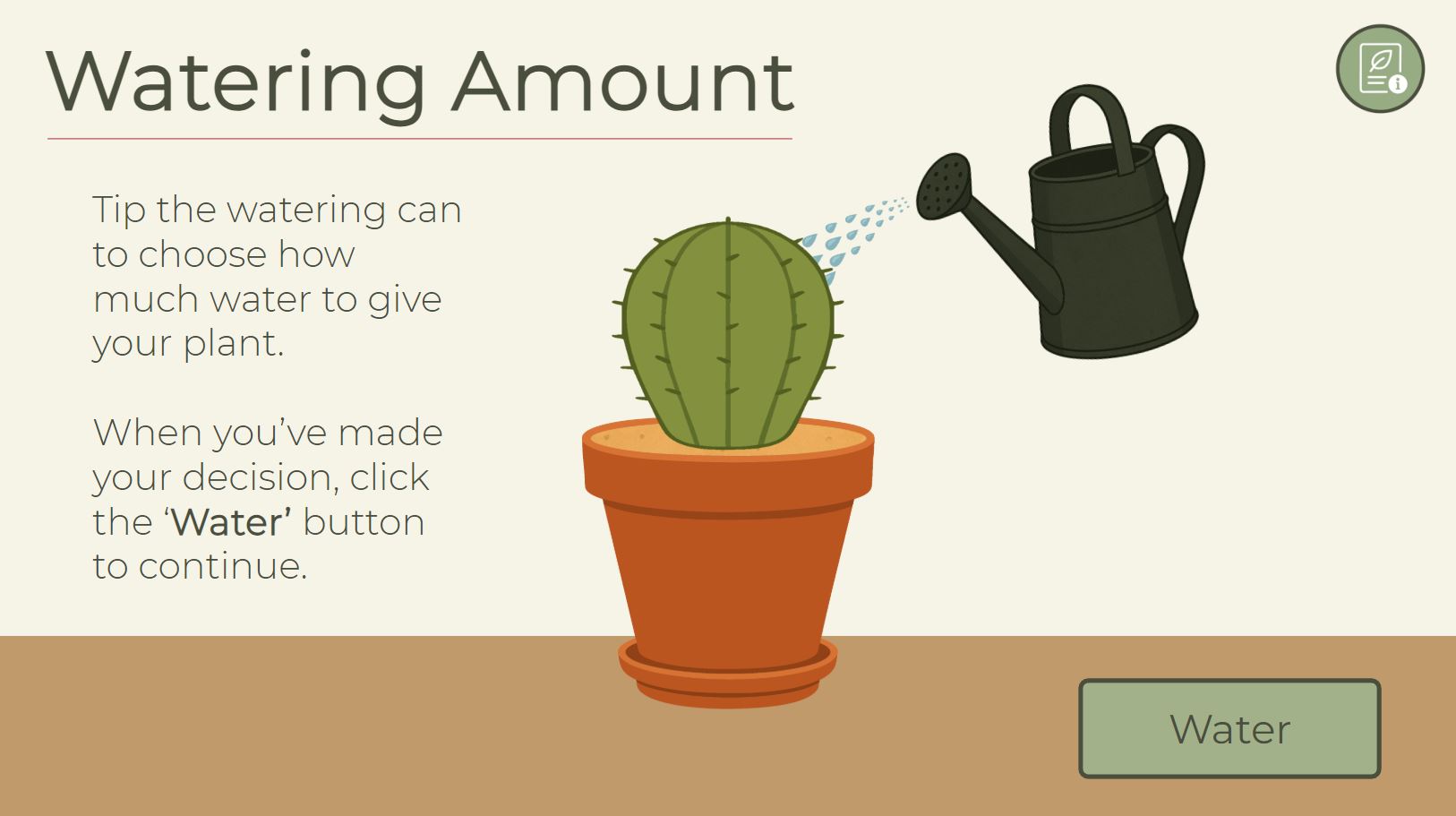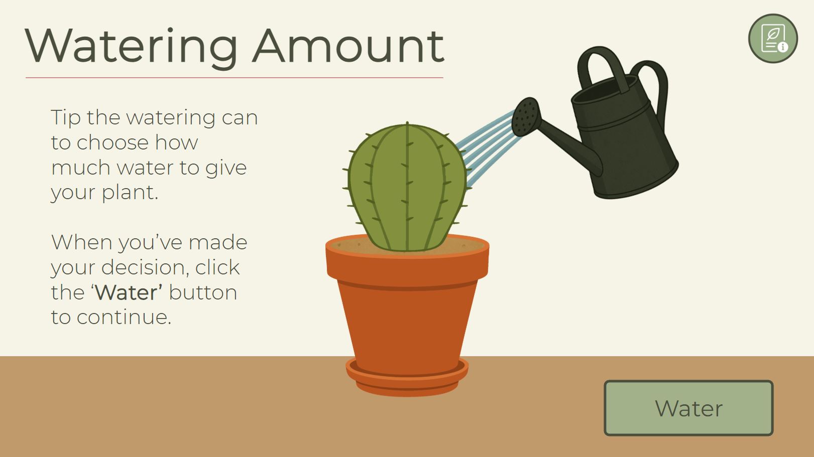 Next, learners experiment with how much water to give their plant using an interactive watering can dial. They can tip the watering can to pour too little, just the right amount, or too much water onto their plant, each choice triggering immediate visual reactions. Engaging sound effects make the interaction feel even more realistic and help learners understand how small changes in watering can have a big impact on plant health.