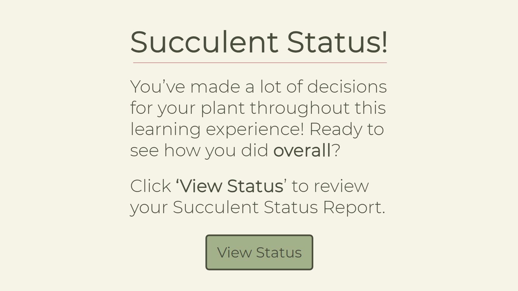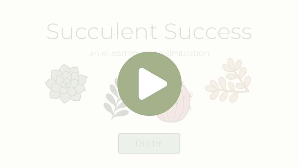 At the end of the experience, learners receive an overall succulent status report that visually shows which care choices they got right out of soil, pot, sunlight, and watering, and summarizes how their plant is doing overall as a result of those choices. Learners can then restart the course to experiment with different decisions or try a different plant. They can also download a “Succulent Success” infographic as a printable reminder of best practices. This approach allows learners to continue interacting with the content until they feel confident and provides a lasting resource for continued succulent success.