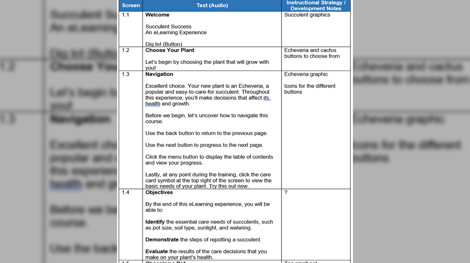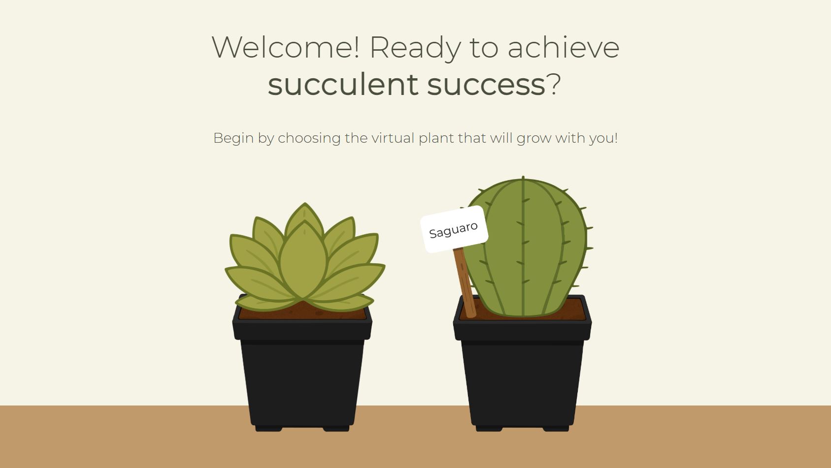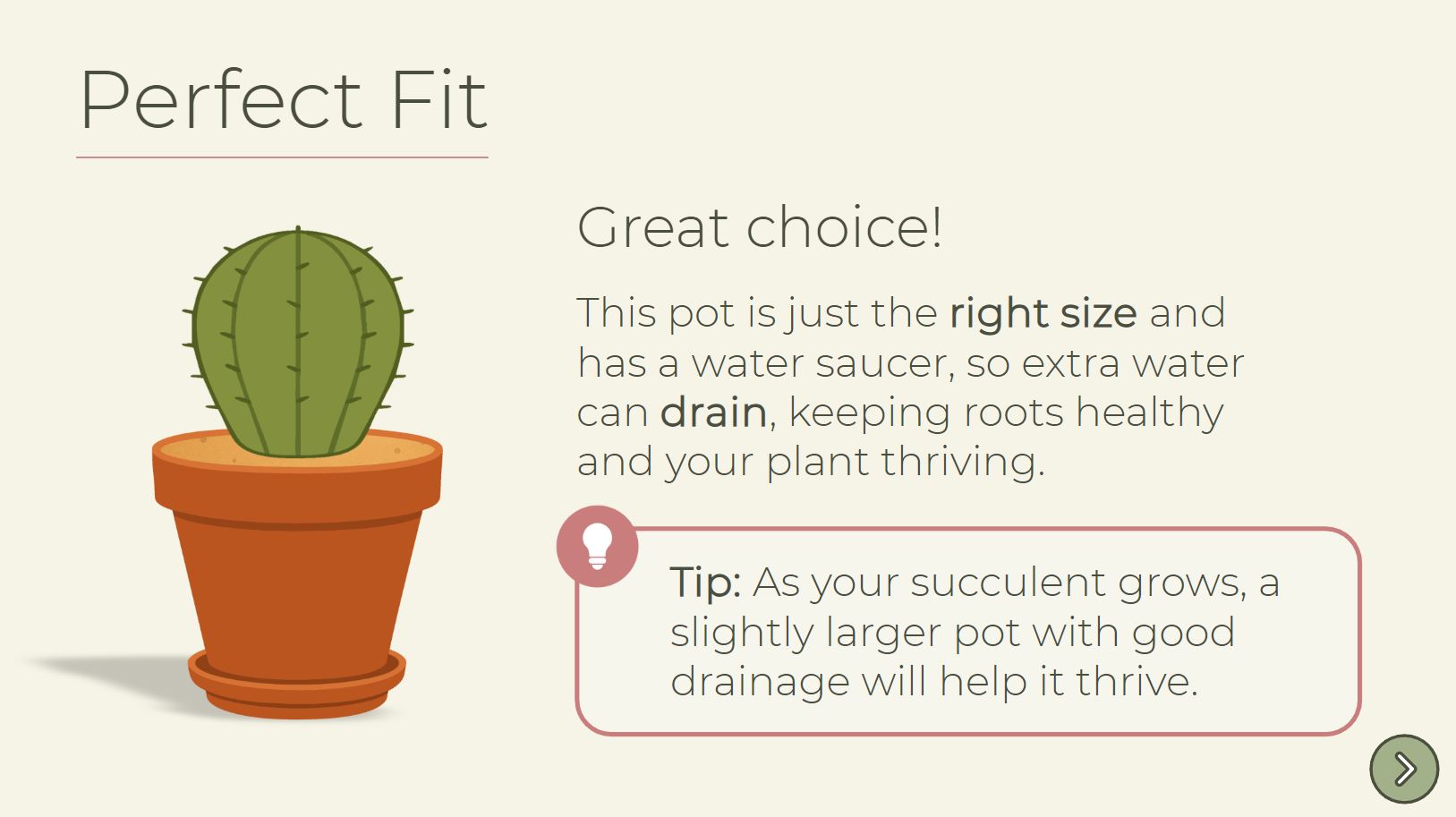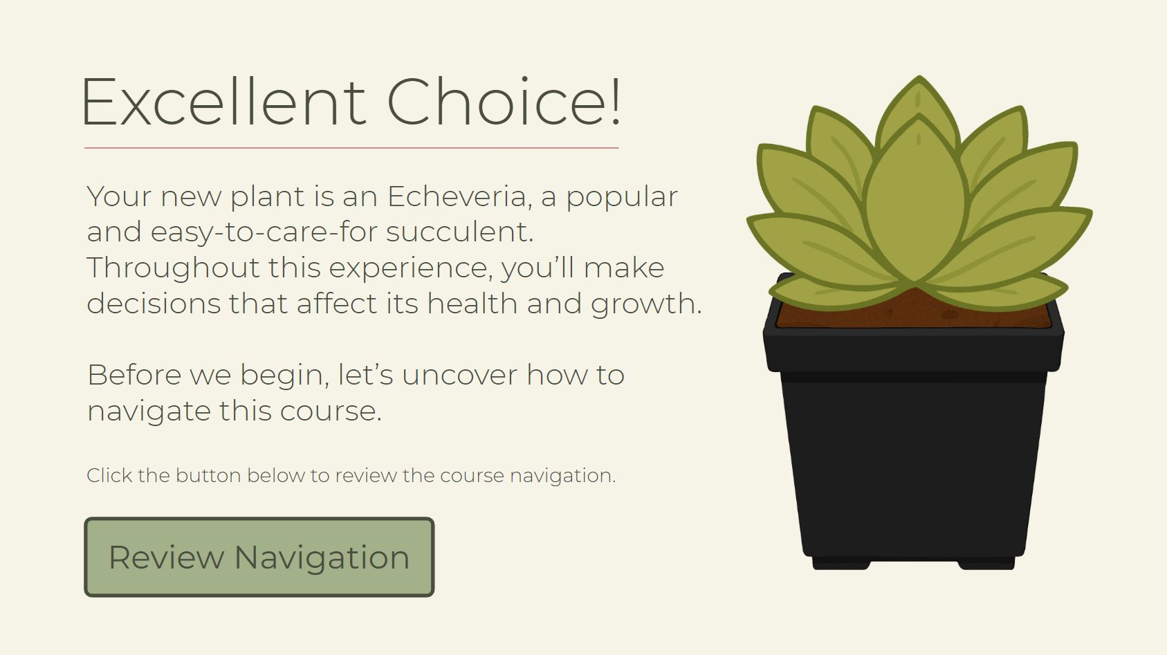 Learners begin by choosing between two virtual succulents: an Echeveria or a Saguaro Cactus. This choice personalizes the experience, as the selected plant accompanies them throughout the course. Each care decision the learner makes affects the plant’s overall well-being, and at the end of the course, they see how their plant is doing based on those choices.