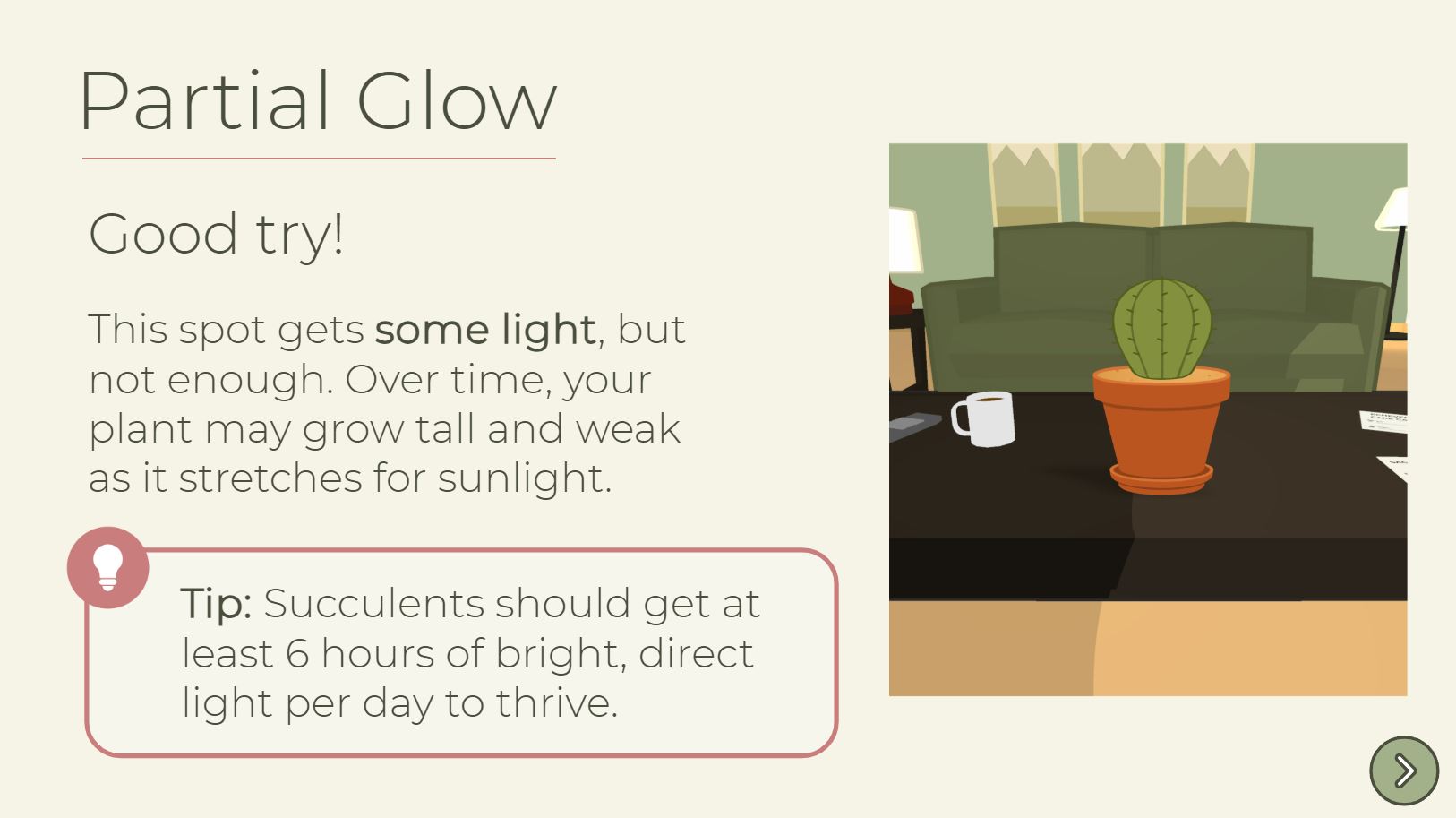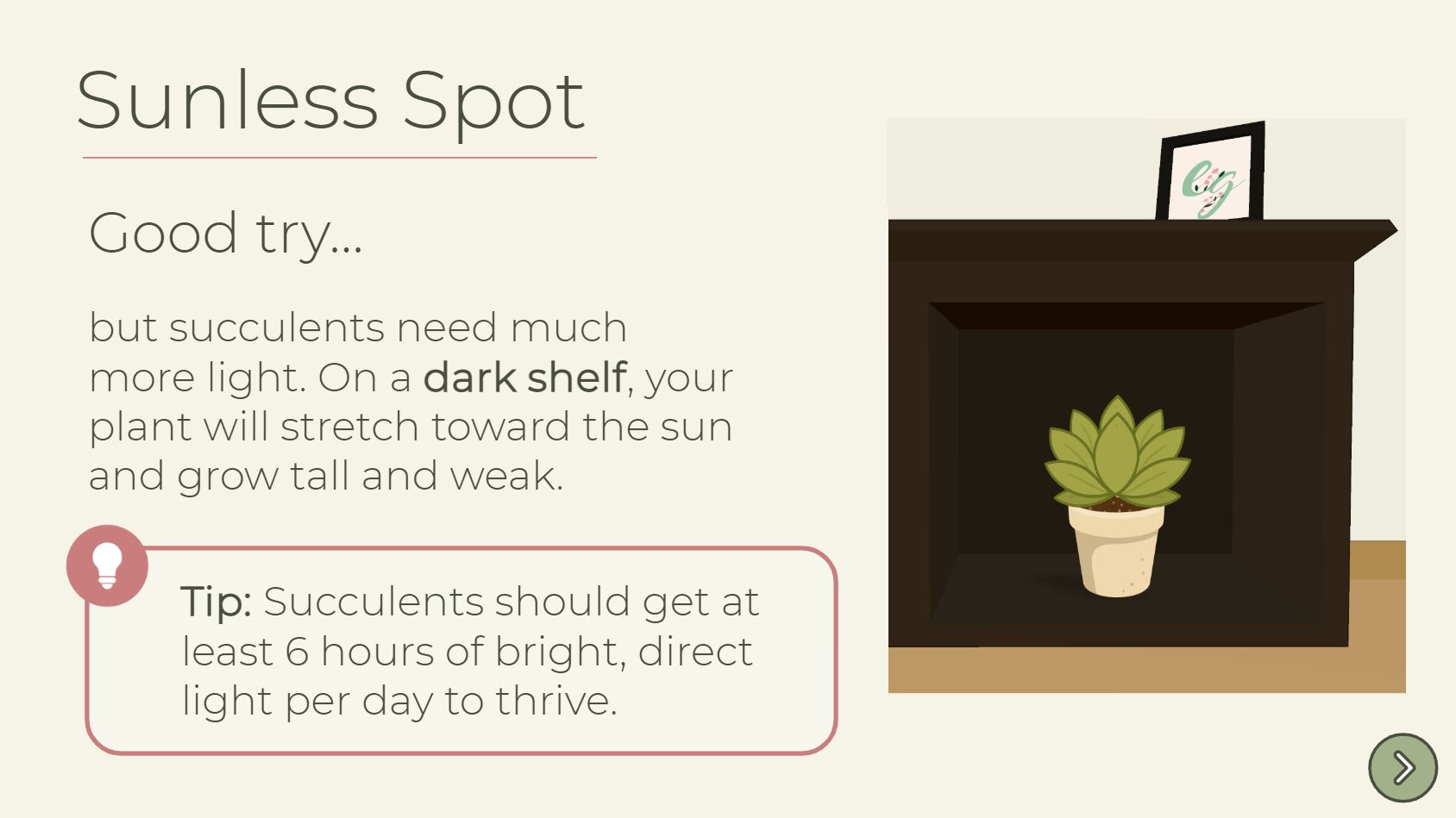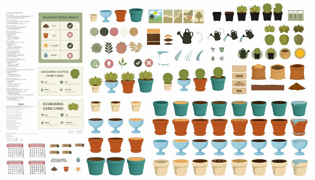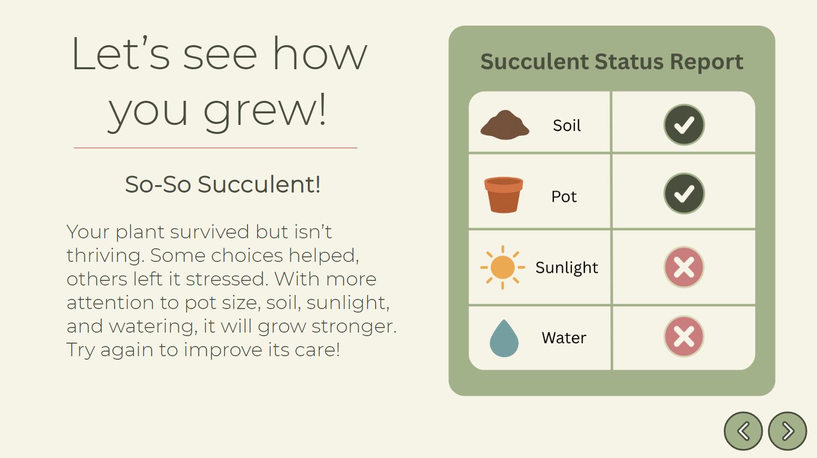 Many people struggle to keep succulents alive. Therefore, the goal of this project is to provide a safe, low-stakes environment for beginners or new succulent owners to experiment with real-world care decisions such as soil type, pot size, sunlight placement, and watering without risking a real plant. This course combines engagement, interactivity, and feedback in an immersive, hands-on format that teaches through doing and helps build confidence in succulent care.