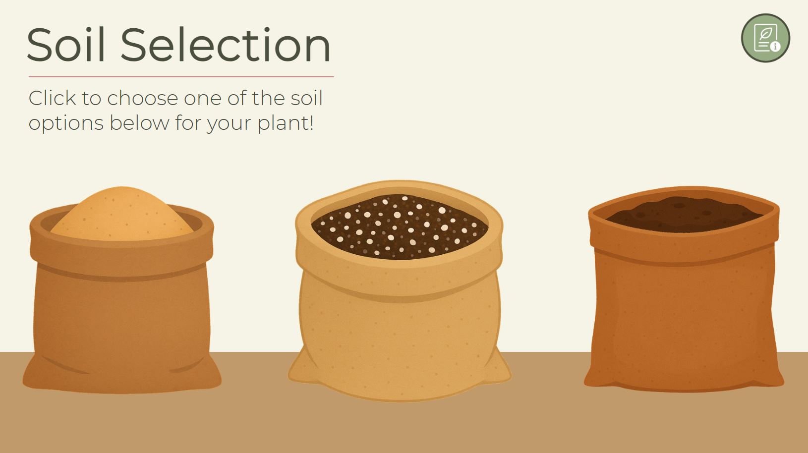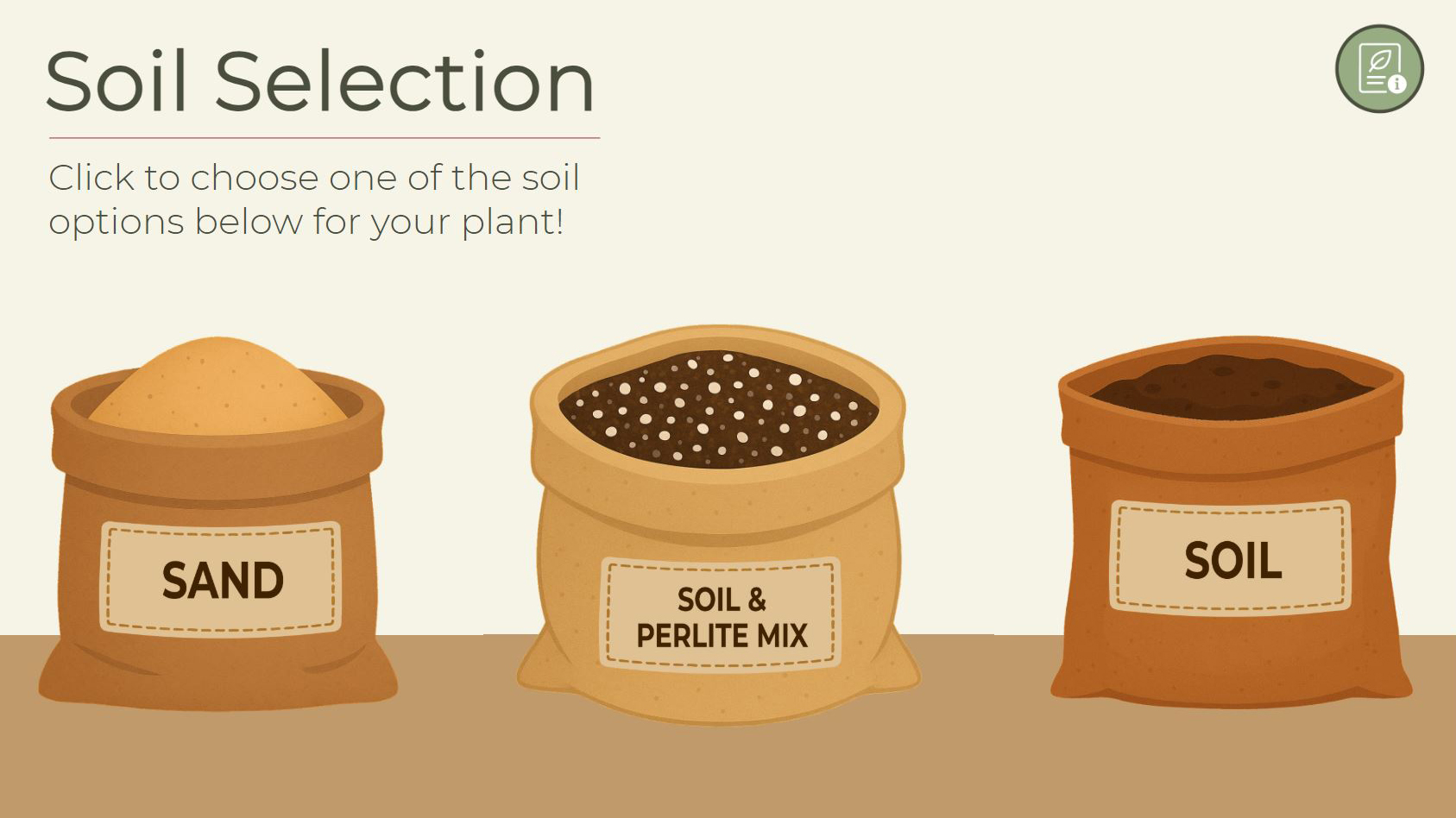 After choosing their plant, the first care decision learners make is selecting soil so their plant can be repotted. They can choose from three options: sand, a soil and perlite mix, or plain soil. Learners may consult their care guide before making a choice and receive immediate feedback upon selection, where they learn that the right mix allows for proper drainage and prevents root rot, both of which are essential for long-term plant health.