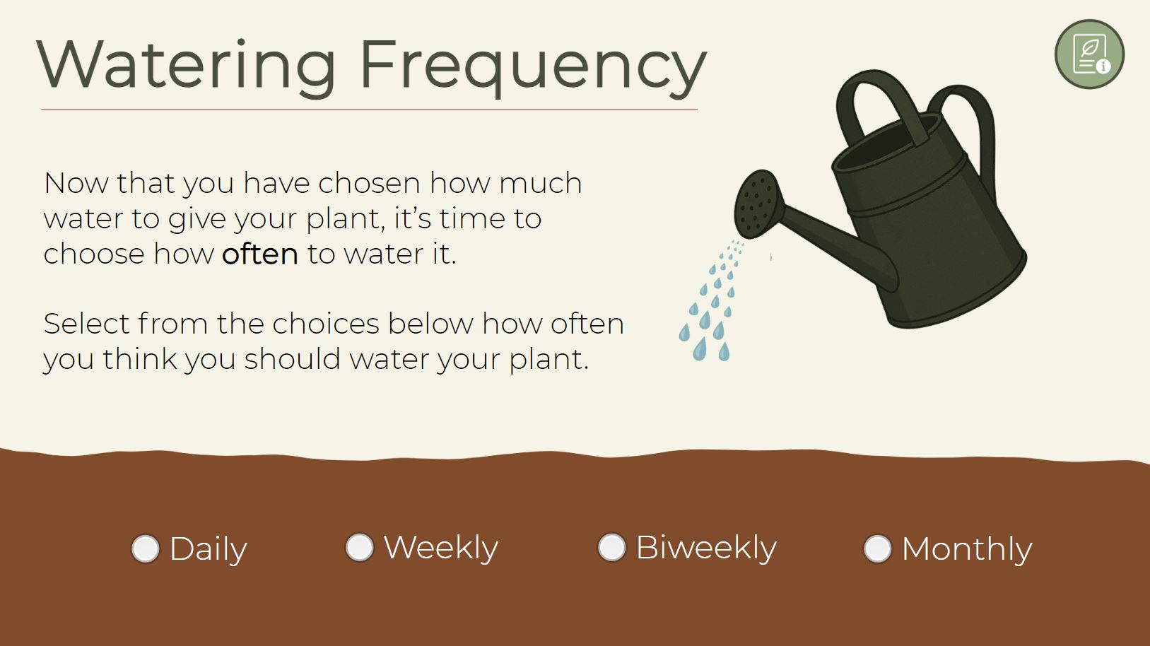 Now that learners have chosen how much water to give their plant, the final decision is how often to water it, using a poll with four options: daily, weekly, biweekly, and monthly. This segment introduces timing and routine, showing that there is no single rule for watering succulents. Instead, they thrive when allowed to dry completely between waterings and are watered only when showing signs of thirst. The activity emphasizes that under-watering is generally safer than over-watering.